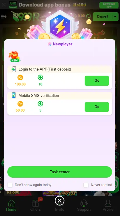 To start with 999R Game follow these simple steps. Click on the referral link https://www.999r.pro/?dl=bhnlf6 you will be redirected to the game website there. Then click on register now and provide your login detail like phone number and set a password this phone number and password will be used for future logins. You can also save the logins on your system next time you will directly be logged in used save info. You are now into the platform game enjoy it. For this you have to click on account profile you will find out option of download the app you will see 2 choices fast download and full download click on any of one option app will be downloaded in ur system. Login to the app using same credentials and enjoy. Note that in some games steps may vary a little bit. Allow permissions and check storage space for smooth installation. Now you are ready to start playing.