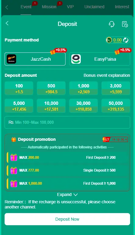 Make First Deposit Choose from verified payment methods like JazzCash, EasyPaisa, bank transfer, or UPay. Start with as low as PKR 100 as minimum deposit required. The platform offers first deposit bonus to boost your starting balance.